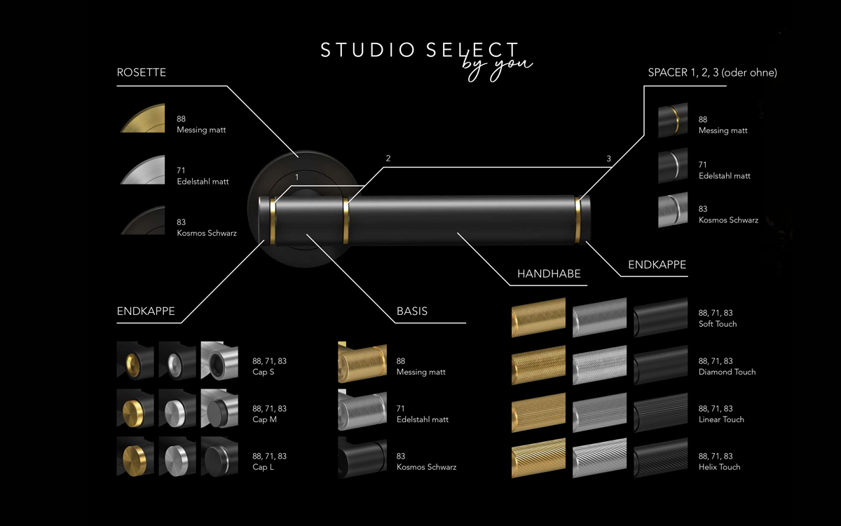 Egal, ob Sie einen modernen, industriellen oder klassischen Look bevorzugen – „STUDIO SELECT by you” ermöglicht es Ihnen Ihrer Kreativität freien Lauf zulassen. Die Vielfalt an Komponenten, Oberflächen, Größen und Farben macht es möglich, dass für jeden Geschmack etwas dabei ist. Egal ob mit Diamond Touch Oberfläche in Edelstahl matt, Kosmos Schwarz oder Messing Matt - die Kombinationsmöglichkeiten sind nahezu grenzenlos. Alle Formen und Farben können individuell gewählt werden, um den perfekten Türgriff zu designen.